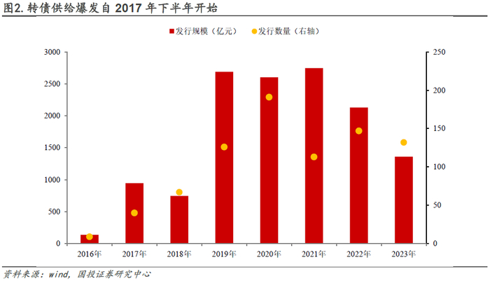 2018年权益市场也是连续向下调整,到10月中旬达到年内低点,之后向上反弹。但是由于2017年2月份再融资新规收紧定增、放松转债发行,之后2017年下半年转债才进入发行高峰期,2018年发行的转债转股价更是处于阶段性低点,虽然2018年权益市场表现较弱、但2018年存续的转债平价普遍未落入较低区间。而19-22年转债发行进入爆发期,叠加权益表现较好,当期发行的转债转股价相对较高。