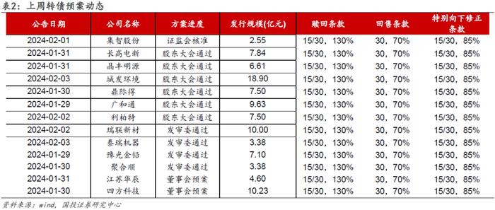 上周新增2家转债预案,分别为江苏华辰(4.6亿元)、四方科技(10.23395亿元);6家公司可转债发行方案获股东大会通过,为长高电新(7.84亿元)、晶丰明源(6.61亿元)、城发环境(18.9亿元)、鼎际得(7.5亿元)、广和通(9.63亿元)、利柏特(7.5亿元);4家公司转债发行获发审委审核通过,为瑞联新材(10亿元)、泰瑞机器(3.378亿元)、豫光金铅(7.1亿元)、聚合顺(3.38亿元);1家公司转债发行获证监会核准批复,为集智股份(2.55亿元)。