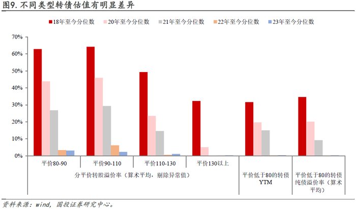 因此由于当前转债市场与18年相比平价更低、机构参与度更高、债底明显抬升三点差异,形成当前转债估值“纺锤型”的估值结构:平衡型转债估值如果与18年相比看起来仍然不够便宜,但是偏债型转债估值已经处于历史较低位置。