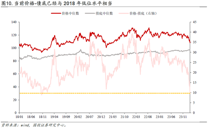 从绝对价格来看,截至2024年2月2日转债价格中位数为107.5、纯债溢价率中位数为9.75%,价格距离债底的距离为9.5元,而2018年10月中旬“价格-债底”差一度达到9元以下,从这一角度来看、当前转债估值已经与2018年相当甚至已经低于2018年。