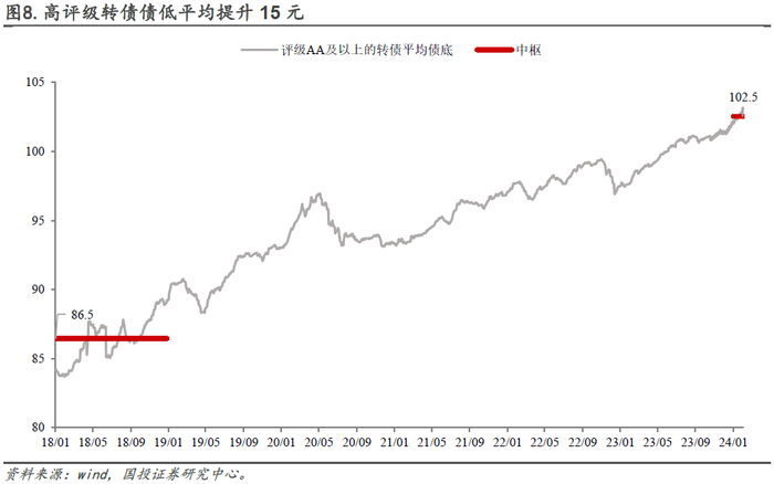 另一方面,由于当前利率水平远低于2018年,也导致当前债底相比2018年有显著提升,2018年主体评级AA及以上的转债平均债底全年中枢仅有86.5元;而今年年初至今同评级转债平均债底连续向上、目前已拉升至103元以上,中枢来到102.5元。当前债底整体比2018年抬升15元。