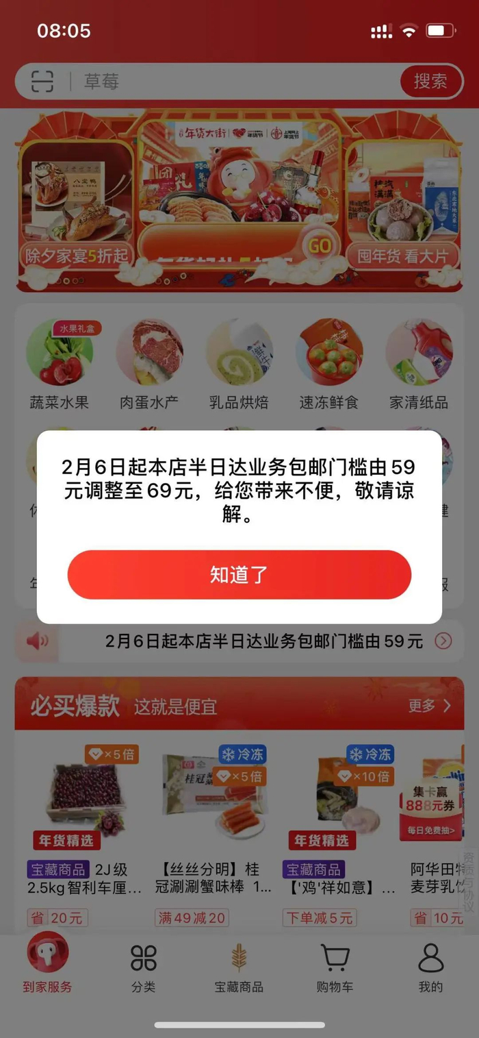 大润发App首页也公布了相关信息,“从2月6日起包邮门槛由59元调整至69元,给您带来不便,敬请谅解。”大润发表示,门槛上调的是“半日达”服务,“小时达”服务在春节期间运费不变。