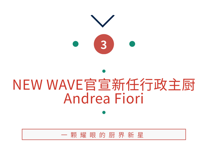 不到而立之年便成为一店统帅,Andrea无疑是一颗耀眼的厨界新星。他出生于罗马,在风景如画加尔达湖畔长大,自小就热衷于美食和烹饪艺术,从少年时期,他便立志要进入高端餐饮领域,做一名为大家带来美味、快乐和惊喜的厨师。如今,Andrea正式接过领衔Cerea 家族亚洲首家美术馆餐厅后厨的接力棒,在NEW WAVE续写这段来自意大利“家之本味”的故事——以传统意大利家味为基石,注入Da Vittorio 独树一帜的精致烹饪风格以及他个人的非凡创造力,结合来自中国本土与世界各地的优质食材,诠释地道而摩登的意大利家味。