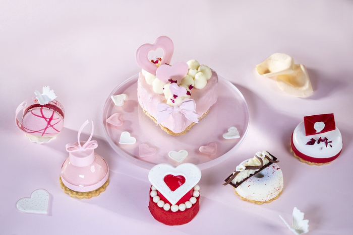 酒店饼房团队根据情人节主题,打造了精美甜品及咸点,售价为人民币888元/套。情人节主题下午茶包含双人份六款甜品、四款咸品及司康,另有两款特调佳酿“花酿年华”及“百川晨光”可供选择。其中甜点包含专属订制的:心形巧克力蛋糕、树莓马卡龙、蓝莓马斯卡布尼慕斯、香蕉酸奶、荔枝慕斯、焦糖椰子塔;咸点精选甜菜头腌渍三文鱼鳄梨,鹅肝千层酥,蟹肉鳄梨酱配脆壳,味囎腰果球配脆饼干等高端食材。