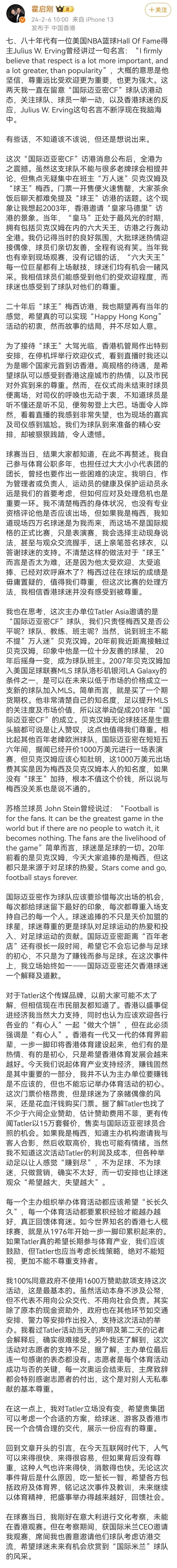 同日,霍启刚在个人微博发布长文:希望可以考虑一个合适的方案,给球迷、游客及香港市民一个合情合理的交代,展示一份应有的尊重。