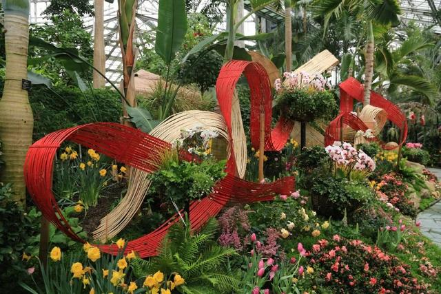 走进热带植物温室,一组龙年花卉景点十分吸引眼球,红色和本色的竹篾打造自然的弧线,由植物组合的云朵贯穿其中,似行云流水,婉转流畅,呈“五彩祥云”“飞龙腾飞”之势,有龙年吉祥、龙腾虎跃的寓意。