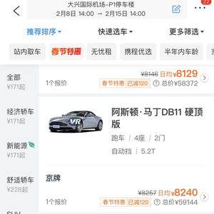 记者在携程租车平台看到,春节期间,北京地区范围内,劳斯莱斯魅影日租金为9600元。玛莎拉蒂MC20日租金为8380元,法拉利488日租金为8129元。保时捷911日租金为4500元。据携程平台管家表示,春节期间起租通常为7天,根据不同的车型会有不同的调整。