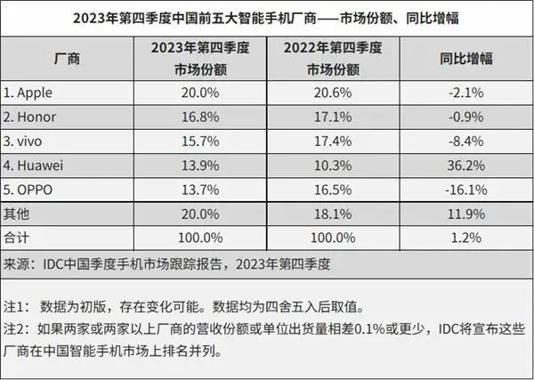 实际上,苹果在大中华市场的营收下滑较大与市场竞争关系很大。IDC数据显示,2023年第四季度中国智能手机行业整体有所回暖,迎来了增长,但这一背景下,iPhone在中国市场的份额却同比下滑了2.1%,这表明苹果正面临挑战。