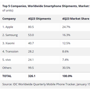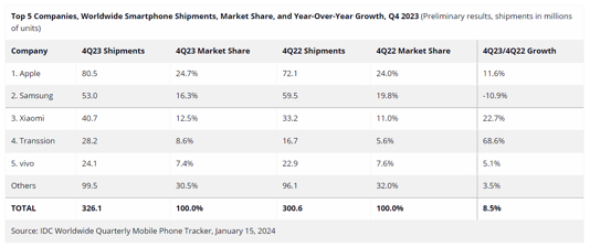 IDC数据显示,iPhone在2023年第四季度的全球出货量达到了8050万台,同比增长11.6%,特别新款iPhone 15的热销,让苹果以24.7%的全球市场份额领先其他厂家。