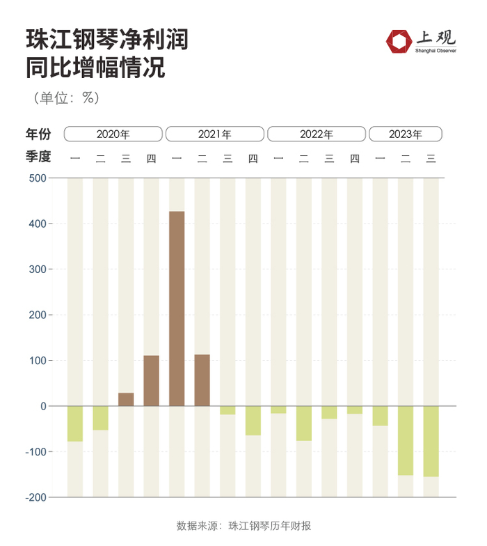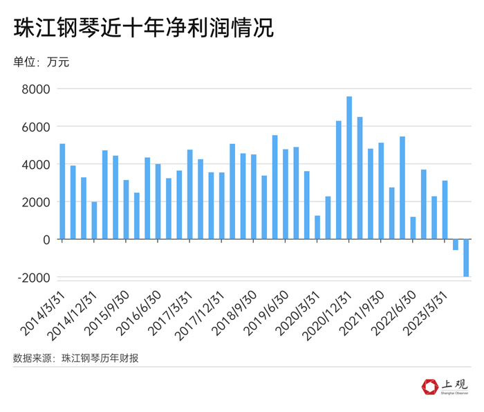 钢琴卖不动的主要佐证,是A股上市公司珠江钢琴的业绩,这家公司的钢琴在国内市场占有率超过40%,在全球市场的占有率也超过30%。根据其财报,去年第二、第三季度珠江钢琴的净利润都为负值,且第三季度亏损加剧,达到2012万元。不过,如果看珠江钢琴近十年的利润情况,就会发现虽然亏损出现在2023年,但其在2020、2022年,都曾出现单季度快速下滑的情况,且利润逐年在下降。