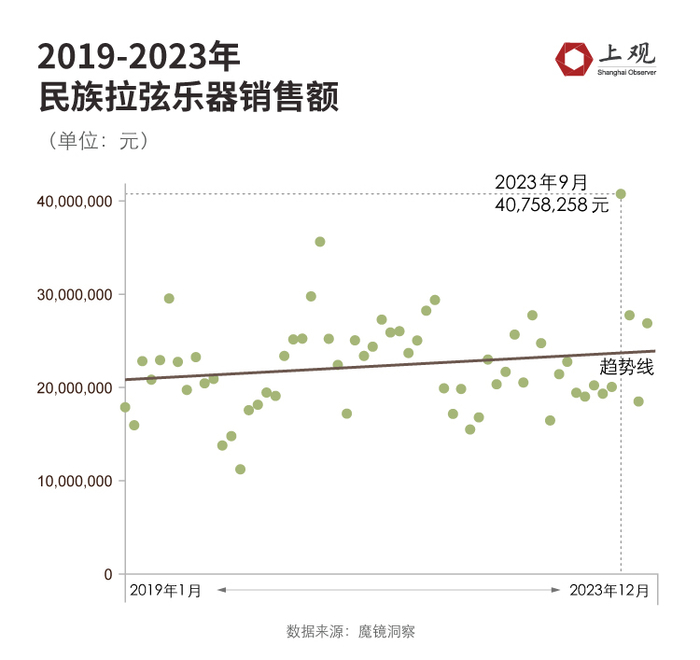 例如琵琶。报告显示,琵琶市场稳步增长,预计到2024年市场规模将达到160亿元,同比年增长率保持在10%以上。根据魔镜洞察的数据统计,近四年来,民族拉弦乐器的销售额较为稳定,虽然也曾受疫情短暂下跌,但整体呈上涨趋势。在2023年9月,线上销售额达到近四年峰值,为4075万元。