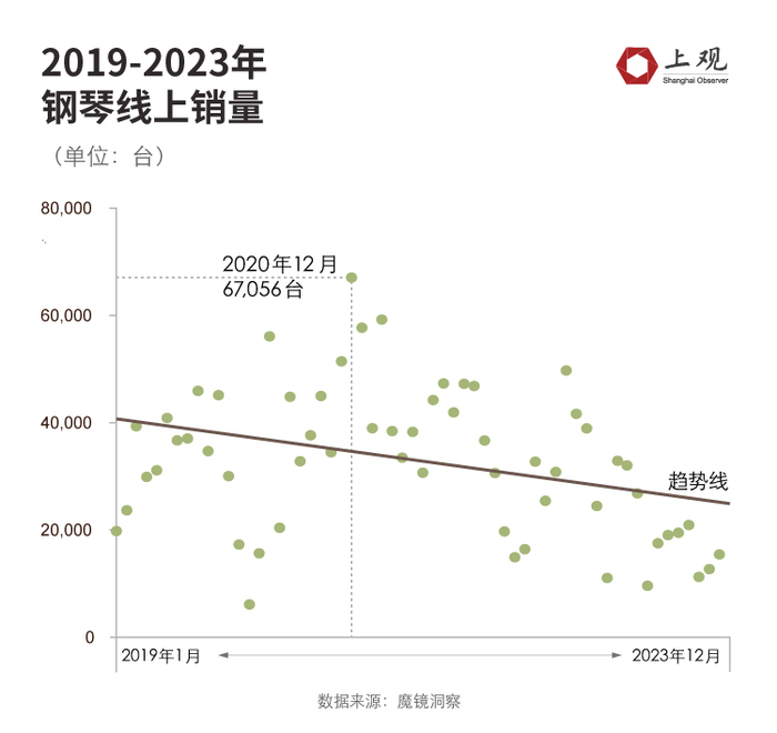 这说明,钢琴这门生意的下滑,在疫情期间就已经十分明显了。而根据魔镜洞察的数据统计,钢琴的线上销量(包括淘宝、天猫线上平台)下滑趋势同样如此,在2020年之后就十分明显。2023年则是最低的一年,约为22.88万台,平均每月销售仅1.9万台。