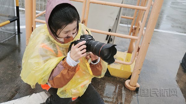 本报记者钱擘在虹桥机场机坪采访C919执飞春运航班(胡夕姮/摄)