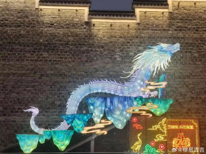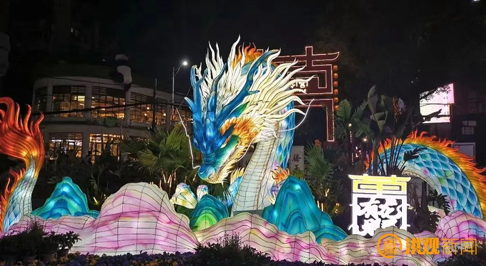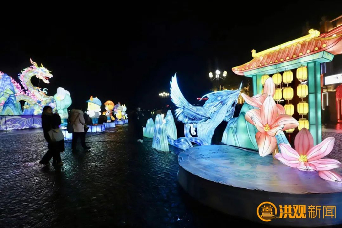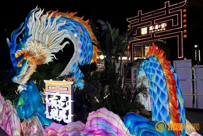 往广场走,还有一条脚踏五彩祥云的“巨龙”,灵动矫健地在空中飞舞,栩栩如生,好似在守护着万寿宫,鎏金璀璨的龙尾格外吸睛。据介绍,整条“龙”由四部分拼接组装,高5米,宽22米,颜色以青色、黄色、红色为主,根据《山海经》里的神兽“青龙”创作而成,看上去非常神圣、威猛,深受市民喜爱。“往年我也会在外地逛灯会,但是没有一场灯会让我像今天这样震撼,家门口的这场灯会点亮新春大地,为我们的生活带来更多幸福感。”市民王一恒表示。
