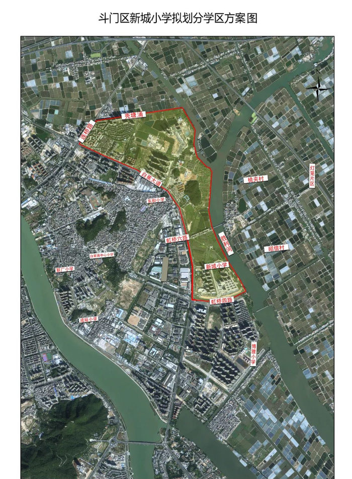 珠海市斗门区新城小学(暂用名,以下简称为“新城小学”)位于白蕉镇虹桥五路北侧,办学规模30个教学班,每年级5个教学班,可提供学位1350个。
