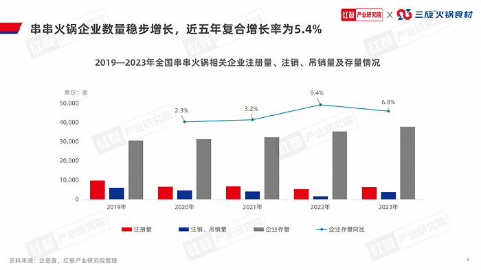 近五年全国串串火锅相关企业存量也一直保持正向增长。企查查数据显示,2023年全国串串火锅相关企业存量近3.8万家,同比增长6.8%。
