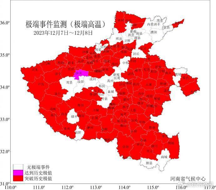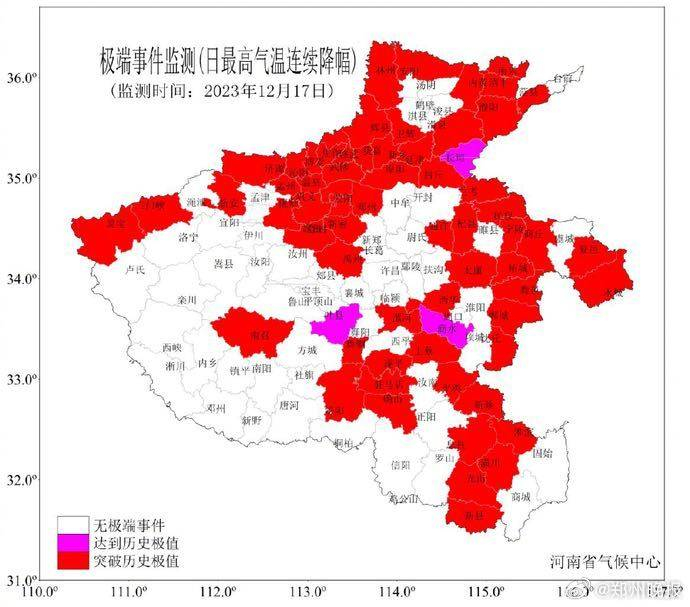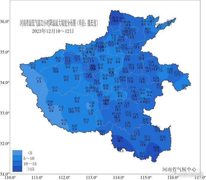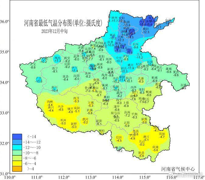 12月前期全省气温异常偏高,7-8日各地最高气温普遍在20℃以上,豫北、豫中、豫西局部最高气温超过25℃,安阳、郑州等89个县(市)日最高气温突破或达到12月历史极值。12月9日起,受多轮强冷空气影响,河南大部持续暴雪、寒潮、低温天气,气温“断崖式”下降,北中部及西部日最高气温连续降温幅度达15到20℃,郑州、漯河、周口等64个县(市)突破12月历史同期极值;在寒潮天气和雪后辐射降温影响下,10日至22日全省气温持续偏低,16日至24日,我省西部、北部最低气温一直在-10℃以下,12月中旬全省平均气温仅为-1.8℃,是1961年以来同期最低值。