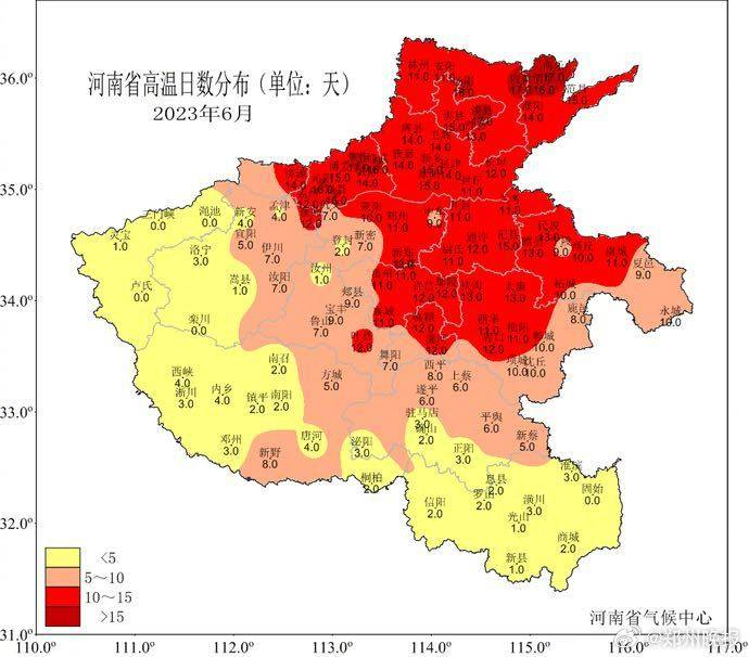 6月全省平均高温日数较常年同期偏多2.6天,豫北及中东大部10天以上,其中豫北局部达15~17天。6月22日至24日,我省淮河以北大部出现高温天气,北部中东部最高气温达37℃以上,部分县市达39~42℃。受持续性高温影响,我省土壤失墒加快,北部、中东部前期降水偏少区域土壤表层出现旱象,土壤表层缺墒站点较高温前(21日)由16%增加至34%;全省用电负荷明显增加。