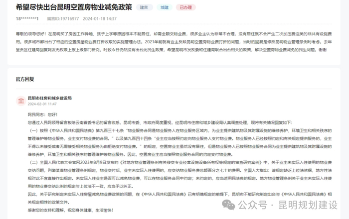 昆明能否出台空置房减免物业费政策?官方回复