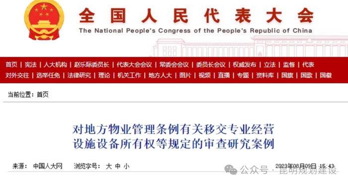 据了解,2023年8月中国人大网发布了《对地方物业管理条例有关移交专业经营设施设备所有权等规定的审查研究案例》。