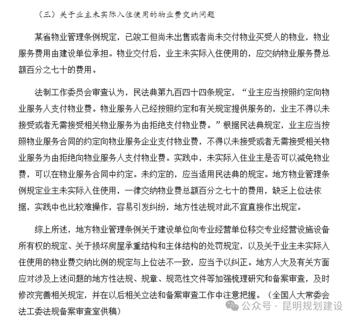 (二)全国人民代表大会官网2023年8月9日发布的《对地方物业管理条例有关移交专业经营设施设备所有权等规定的审查研究案例》中,关于业主未实际入住使用的物业费交纳问题,列举某省物业管理条例规定,物业交付后,业主未实际入住使用的,应交纳物业服务费总额百分之七十的费用。