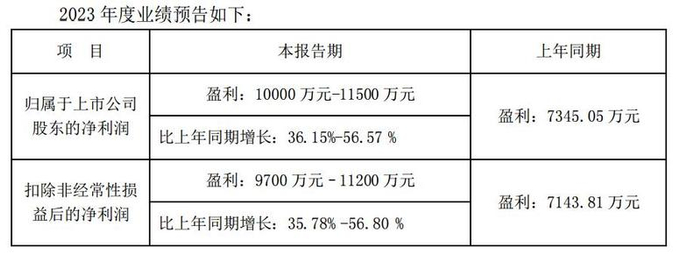 盛德鑫泰1月19日发布的2023年业绩预告显示:根据公司未经审计的初步测算结果,2023年度归属于上市公司股东的净利润预计为10000万元-11500万元,同比增长36.15%-56.57%;扣除非经常性损益后的净利润预计为9700万元–11200万元,同比增长35.78%-56.80%。
