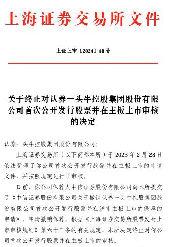 上交所:终止对认养一头牛控股集团股份有限公司首次公开发行股票并在主板上市审核