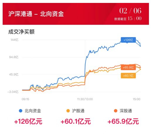 北向资金全天净买入126.05亿,其中沪股通净买入60.13亿元,深股通净买入65.92亿元。