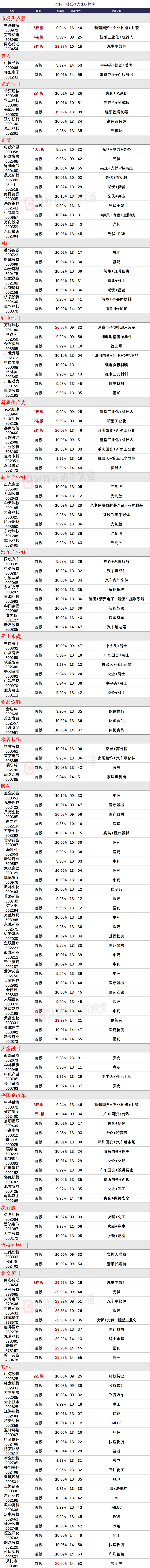 财联社2月6日讯,今日137股涨停,88股炸板,封板率为64%,中基健康5连板,克来机电4连板,北交所同心传动30CM3连板,赛摩智能20CM2连板,长江通信、洪涛股份、中重科技2连板,省广集团3天2板,电投产融4天2板,艾德生物、万祥科技、艾比森、荣昌生物、光库科技 20CM首板,北交所坤博精工、九菱科技、峆一药业、新赣江、科强股份、大地电气、大唐药业、鹿得医疗30CM首板。盘面上,两市超3500家个股上涨;板块方面,创新药、大基金持股、证券、小金属等板块涨幅居前,ST板块、教育、新型城镇化、房地产等板块跌幅居前。