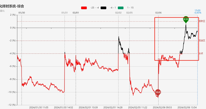 指标显示,今早短线情绪在昨日收盘点位基础上大幅回升至冰点区附近开盘,在早盘冲高回落后,下午在指数持续扩大涨幅带动涨停数量显著增加并反超跌停个股家数提振下,短线情绪午后加速回升并一度逼近活跃区,不过受到资金回吐拖累,尾盘跌停个股家数再度增多,短线情绪小幅回落并微幅收低于0轴下方。