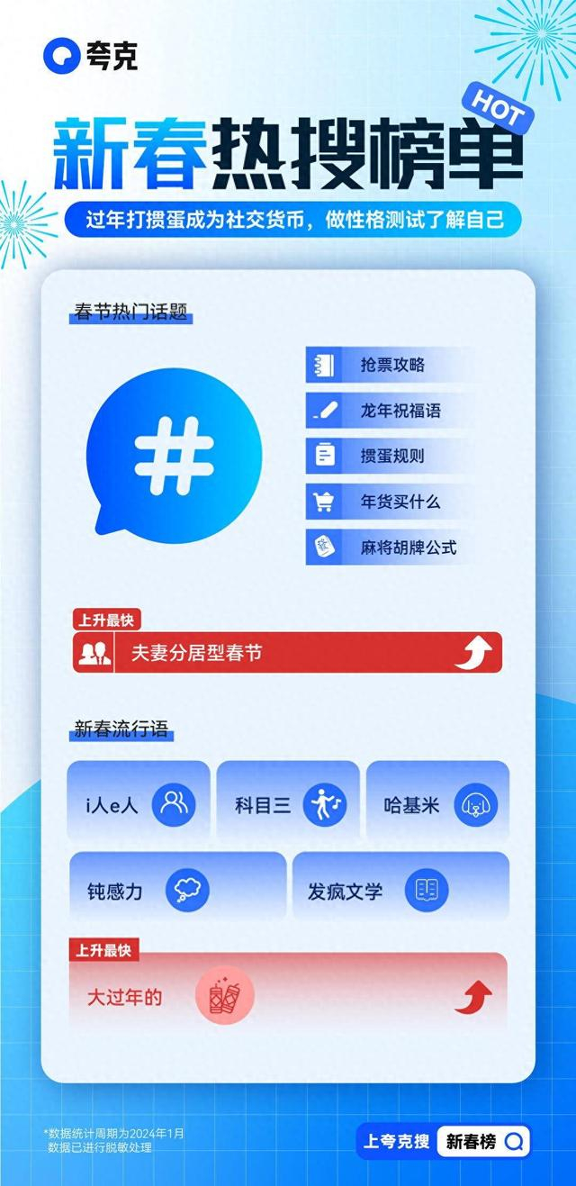 随着年轻人逐渐成长为消费市场的主力军,办年货、寻年味的主场都开始发生了变化,为年轻人提供了情绪价值的各种精神和物质“食粮”也逐渐火爆。作为贴合年轻人“原生属性”的搜索平台,夸克APP此次发布的“新春榜”,似乎可以让更多人看到属于年轻人自己心目中的春节是什么样的。业内人士认为,这些来自于夸克APP的热搜数据和热搜知识中,可以镜像最真实的年轻人的信息需求,也是比较全面的当代年轻人画像,完整展示了追求新奇与个性化表达,追求悦己的同时又要新潮有趣的现代年轻人的多面属性,这届年轻人喜欢选购新颖有趣的潮玩年货来装点节日氛围,同时也借玩交友,开展兴趣社交,而更多年轻人喜欢什么,想做什么,夸克热搜数据中或许可窥一斑。