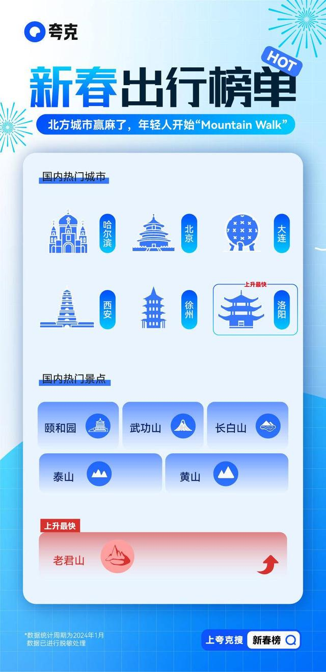 春节期间出游也是年轻人关注的热点,而在众多南方小土豆带火“尔滨”之后,出游的半径在热搜上进一步扩大,北方城市赢麻了,哈尔滨、北京、大连、西安、徐州相继进入了年轻人的旅游计划清单,成为热搜前五城市,而热度上升最快的竟然是洛阳。此外,年轻人的旅游脚步并不局限于城市,很多人也热衷于去山里寻找人生旷野,冲上夸克热搜的国内热门景点有不少是名山大川,武功山、老君山、泰山、黄山都是人们向往的地方,而今年大火的老君山更是成为热搜上升最快的冬季旅游胜地。
