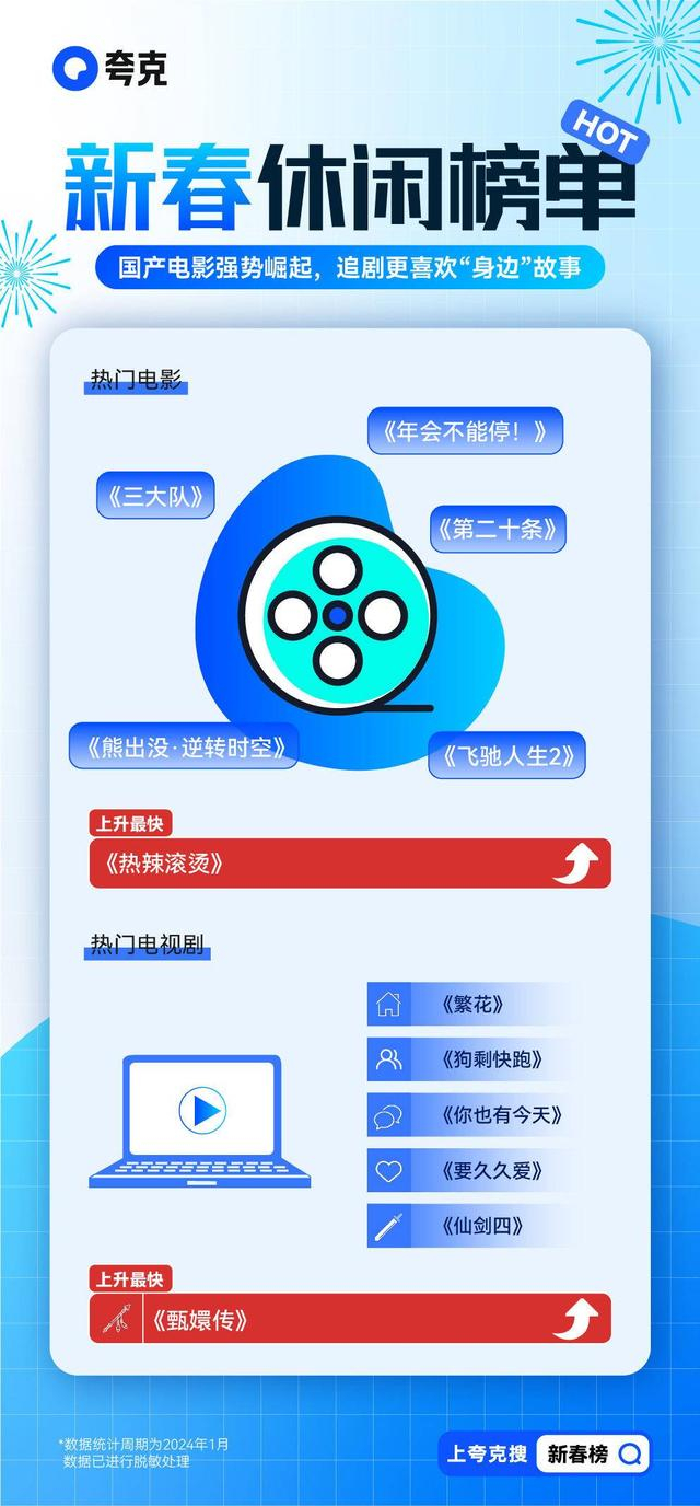 除了国潮衣服和各种潮玩,今年各种国产电影和电视剧也成为年轻人的春节“宠儿”,被这届年轻人送上热搜榜单的热门电影包括《年会不能停!》、《三大队》、《第二十条》、《熊出没·逆转时空》、《飞驰人生2》,而夸克热搜上升速度最快的则是最近大火的《热辣滚烫》。