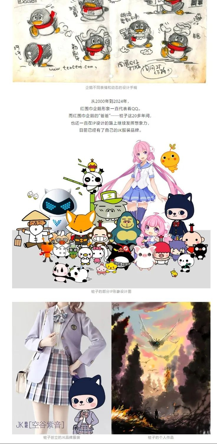 据介绍,桩子在这 20 多年间一直在 IP 设计的路上继续发挥想象力,目前已经有了自己的 JK 服装品牌。此外,桩子还为 QQ 绘制了一幅 25 周年贺图。