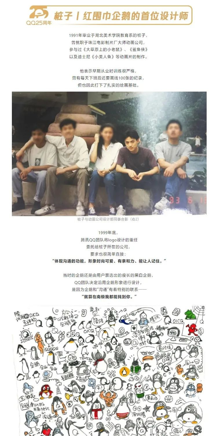 据介绍,这只企鹅的设计并非 QQ 团队主导,而是 1991 年毕业于湖北美术学院教育系的设计师“桩子”。