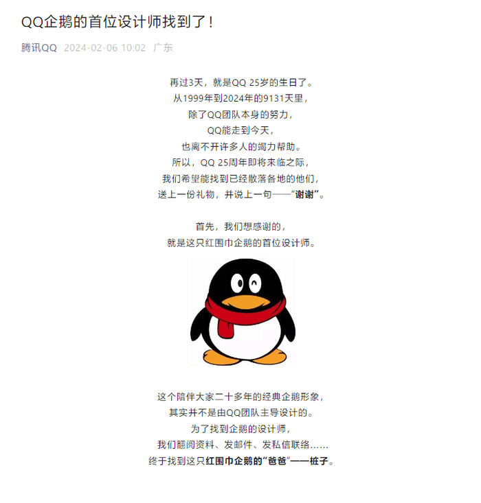 腾讯方面称,再过 3 天就是 QQ 25 岁的生日了,想要感谢许多人,首先需要感谢的是这只“红围巾企鹅”的首位设计师。