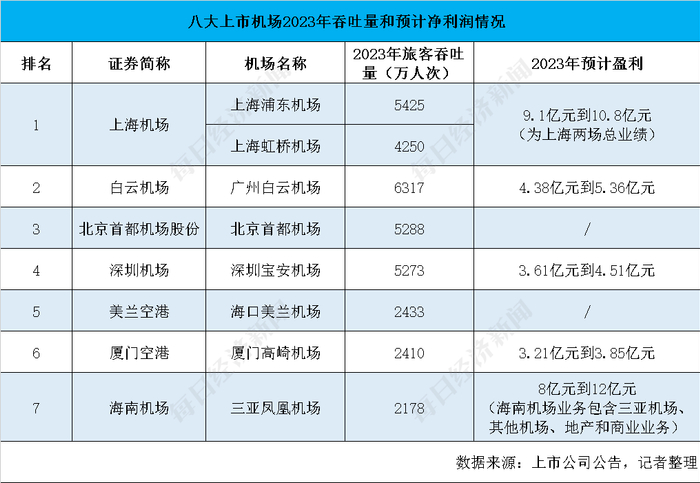 1月末,上市机场陆续公布2023年业绩预告和年度吞吐量数据。随着2023年民航业的全面复苏,几大上市机场均实现了盈利(未公布业绩预告的除外)。其中,上海机场(600009.SH,股价34.27元,市值852.8亿元)、白云机场(600004.SH,股价9.74元,市值230.52亿元)、深圳机场(000089.SZ,股价6.33元,市值129.81亿元)成功扭亏为盈,海南机场净利润同比减少约35.36%—56.90%,厦门空港(600897.SH,股价11.88元,市值49.53亿元)净利润同比增加1042%—1270%。