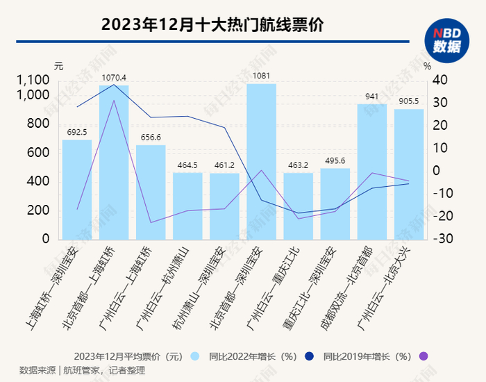 与此同时,伴随国内市场复苏,机票价格的波动频频引起旅客关注。以十大繁忙航线为例,2023年12月,其中半数航线的平均票价相比2022年同期出现上涨,涨价最多的是“北京首都—上海虹桥”航线,均价1070.4元,同比上涨38.5%;其余4条航线的涨价幅度也均在20%—30%之间。