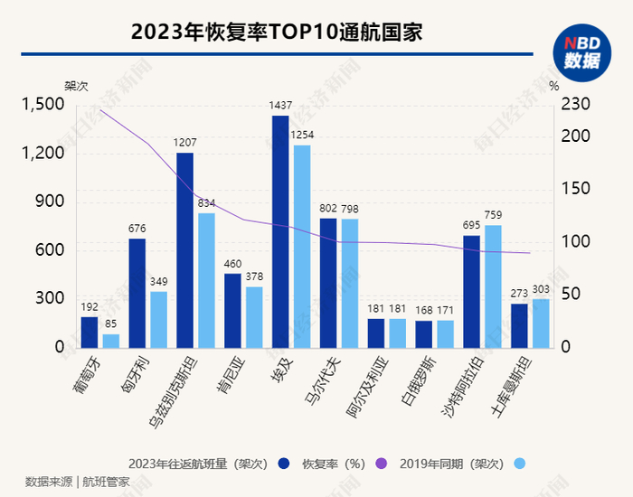 部分通航国家的恢复率较为突出。据航班管家数据,已经有7个国家的国际航班恢复率超过100%(含),包括葡萄牙、匈牙利、乌兹别克斯坦、肯尼亚、埃及、马尔代夫和阿尔及利亚,白俄罗斯、沙特阿拉伯、土库曼斯坦等国的恢复率也超过90%。