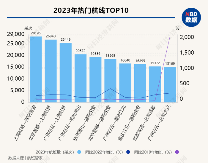 2023年,“上海虹桥—深圳宝安”(往返,下同)是国内最繁忙的航线,累计航班量为28195架次,同比增长116.2%。紧随其后的是“北京首都—上海虹桥”和“广州白云—上海虹桥”,累计航班量分别为26840架次和25449架次。