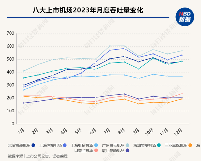 具体到各大机场的每月表现,《每日经济新闻》记者梳理发现,八大上市机场的吞吐量波动趋势基本一致,均是在2023年7月及8月迎来年内的吞吐量高峰,在2023年10月形成一个小高峰。这两个峰值,分别是受益于暑期和国庆假期的旅游热潮。