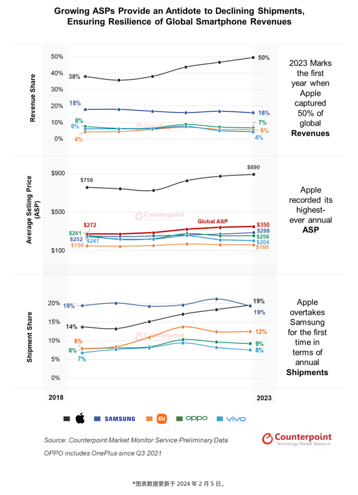 Counterpoint数据显示:2023年全球智能手机市场ASP平均售价是350美元(约2517元),五大厂商的平均售价分别为:苹果 890美元(约6401元);三星 288美元(约2071元);OPPO 256美元(约1841元);vivo 204美元(约1467元);小米160美元(约1150元)。