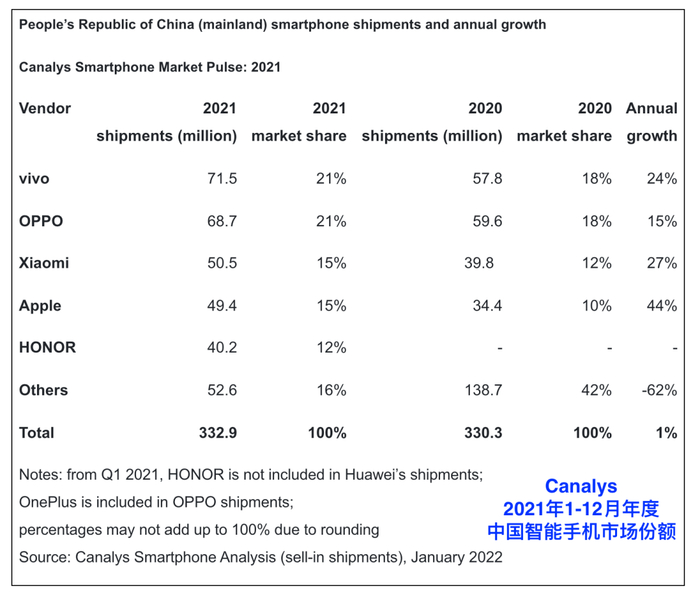 再往前,2021年,以Canalys发布的2021年(1-12月)全年度中国智能手机市场份额数据为参考,vivo以21%的份额登顶,确实是连续三年国产第一。不知道2024年会表现如何~希望海外市场也别落下~