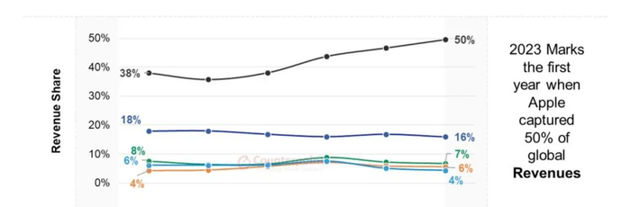 具体2023年全球智能手机营收份额占比来说,苹果以50%的高占比领跑,随后为三星(16%)、OPPO(7%)、小米(6%)、vivo(4%)。出货量份额从高到低则依次是苹果、三星、小米、OPPO、vivo。
