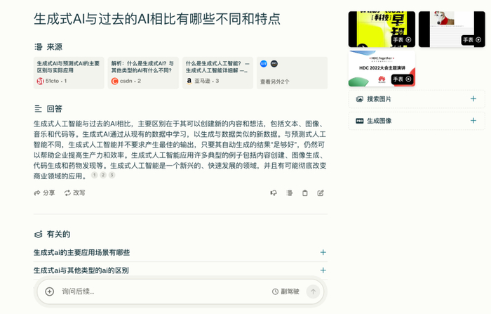 Perplexity不仅能够回答简单问题,还能理解用户一些比较复杂的问题,比如当用户就“生成式AI与过去的AI相比有哪些不同和特点”进行提问时,Perplexity也能进行回答。
