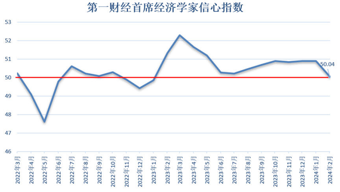 2024年2月,第一财经研究院发布的“第一财经首席经济学家信心指数”为50.04,维持在50荣枯线以上。经济学家预计去年底至今的各类政策逐渐落地,2024年经济将继续修复。