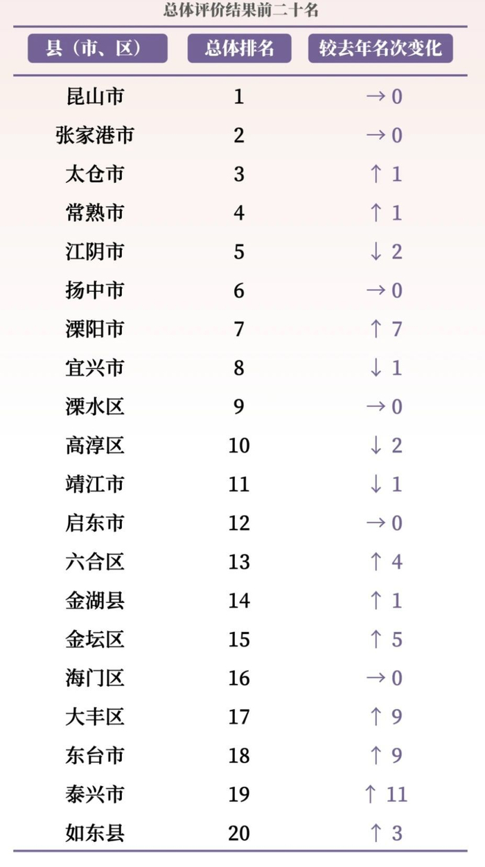 交汇点客户端消息,近日,江苏省县域现代化发展水平报告发布,县域总体评价结果二十强出炉。与2022年总体评价结果相比,昆山、张家港分别蝉联第一、第二;溧阳首次挺进前十,位列第七。