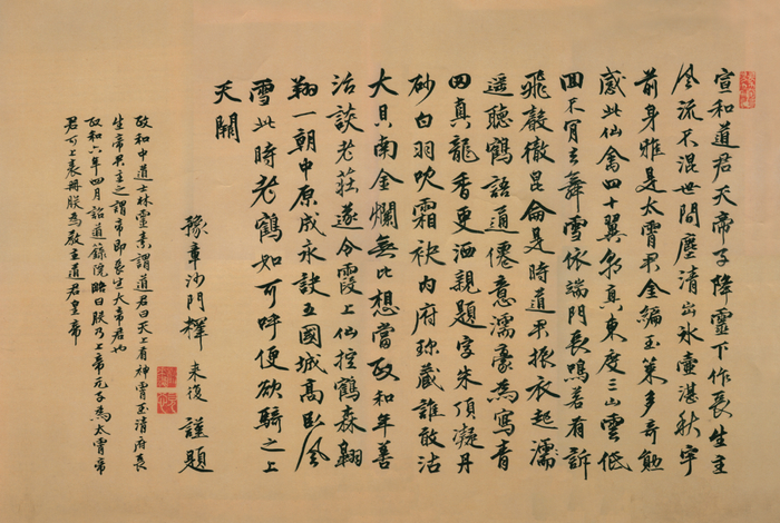 这位宋徽宗便是史上著名的皇帝画家,他的画家生涯取得了辉煌的成功。作为美术教育家,他创办的宫廷画院培养了王希孟、张择端等一批杰出的画家。作为艺术出版家,他组织编撰的《宣和书谱》、《宣和画谱》和《宣和博古图》等书,是美术史研究中的珍贵史籍,至今仍有极其重要的参考价值。作为书法家,他创造出独树一帜的“瘦金体”,瘦挺爽利,与其所画工笔重彩相映成趣。