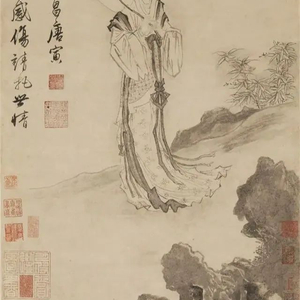 唐伯虎是写意画法的丹青妙手,仅以笔蘸浓淡墨,用行云流水描加折芦描,勾写出人物婀娜多姿的体态造型,刻画出玲珑精巧的五官,勾勒出衣袂飘飘的服饰。他用笔利爽、线条遒劲,提按使转极具法度,焦浓重淡妙用合理。