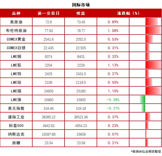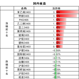 国际贵金属期货普遍收涨,COMEX黄金期货涨0.47%报2052.5美元/盎司,COMEX白银期货涨0.37%报22.505美元/盎司。美联储梅斯特表示,仍倾向于2024年进行三次降息;不愿提供降息的时间安排,认为没有降息的急迫性;在决定利率之前需要更多数据。